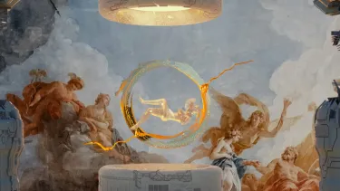 Simone Young stands with arms to the side in front of the Sydney Symphony Orchestra with a full choir insider the Concert Hall
