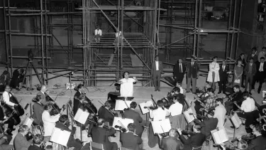 Framed by exposed masonry and concrete, with their principal conductor István Kertész at the podium, the LSO performs Schubert’s Ninth Symphony for a small audience of workers and guests. There’s no audio on the old newsreel, so we can’t hear the result, but the reports aren’t exactly encouraging.