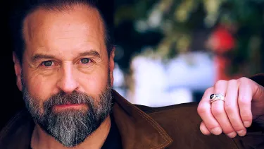A portrait of a man with glasses in a dark shirt and coat standing in front of a stone building on a sunny day.