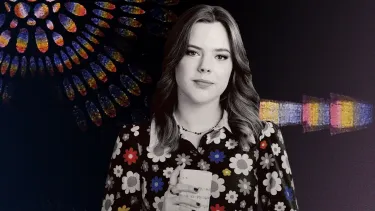 A woman wearing a dark orange jacket looking off to the side, with concrete beams in the background.