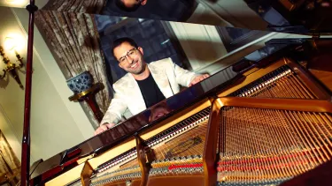 A smiling man with light brown hair wearing a dark shirt sits against a dark, softly lit background.