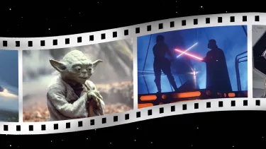 The string section of an orchestra on stage mid-performance, all wearing black, with bows raised.