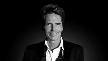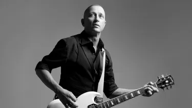A white man with bowl-cut style hair looks down at the camera holding a white bird.