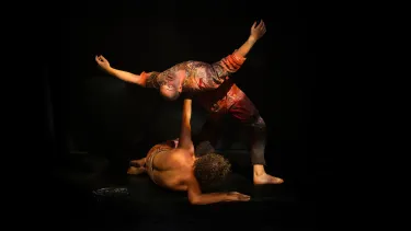 Two dancers in off-white textured costume with arms interlocked and white clay on their bare arms, against a dark green background.