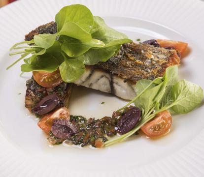 Snapper acqua pazza, medley tomato, olives, capers, white wine, mussels, parsley