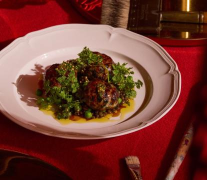 Pork, spinach and wild mushroom crepinettes with lentils and mustard sauce
