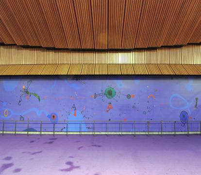 His seminal mural ‘Salute to Slessor’s 5 Bells’ (1971-73), was commissioned for the Concert Hall Northern Foyer and unveiled when the House opened to the public in 1973. Inspired by Kenneth Slessor’s 1939 poem ‘Five bells’ and designed to be viewed after dark, it is unveiled at night and takes viewers into a dream-like underwater nocturnal space.